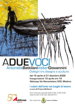Protagonisti della mostra, ospitata presso la sede di Abitcoop, sono gli artisti Antonella Battilani e Valter Giovannini, in un dialogo tra disegno e scultura capace di unire segno e materia in un percorso espositivo originale.