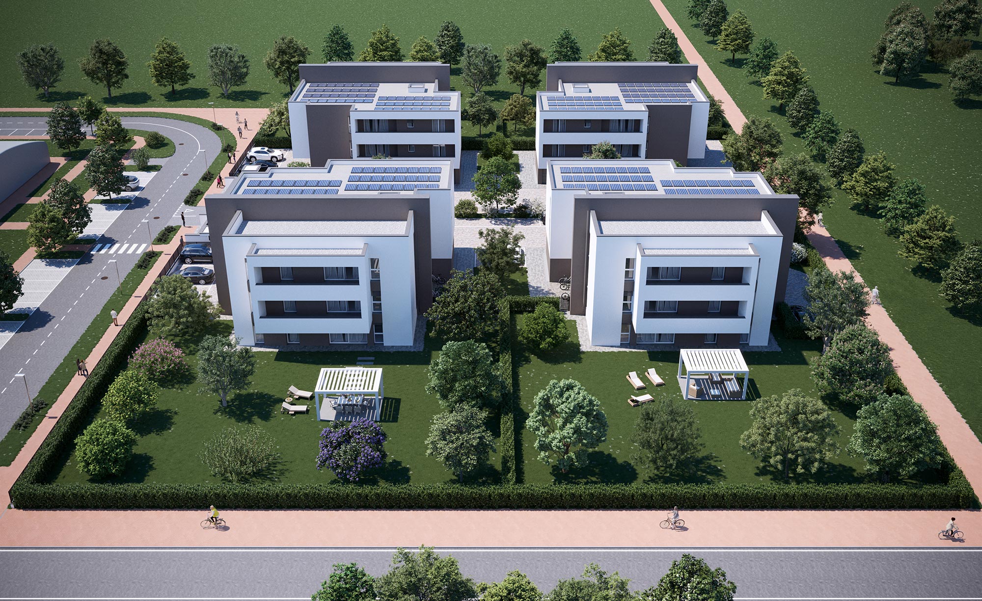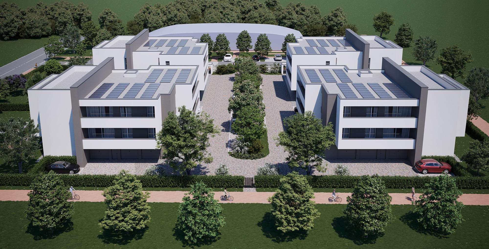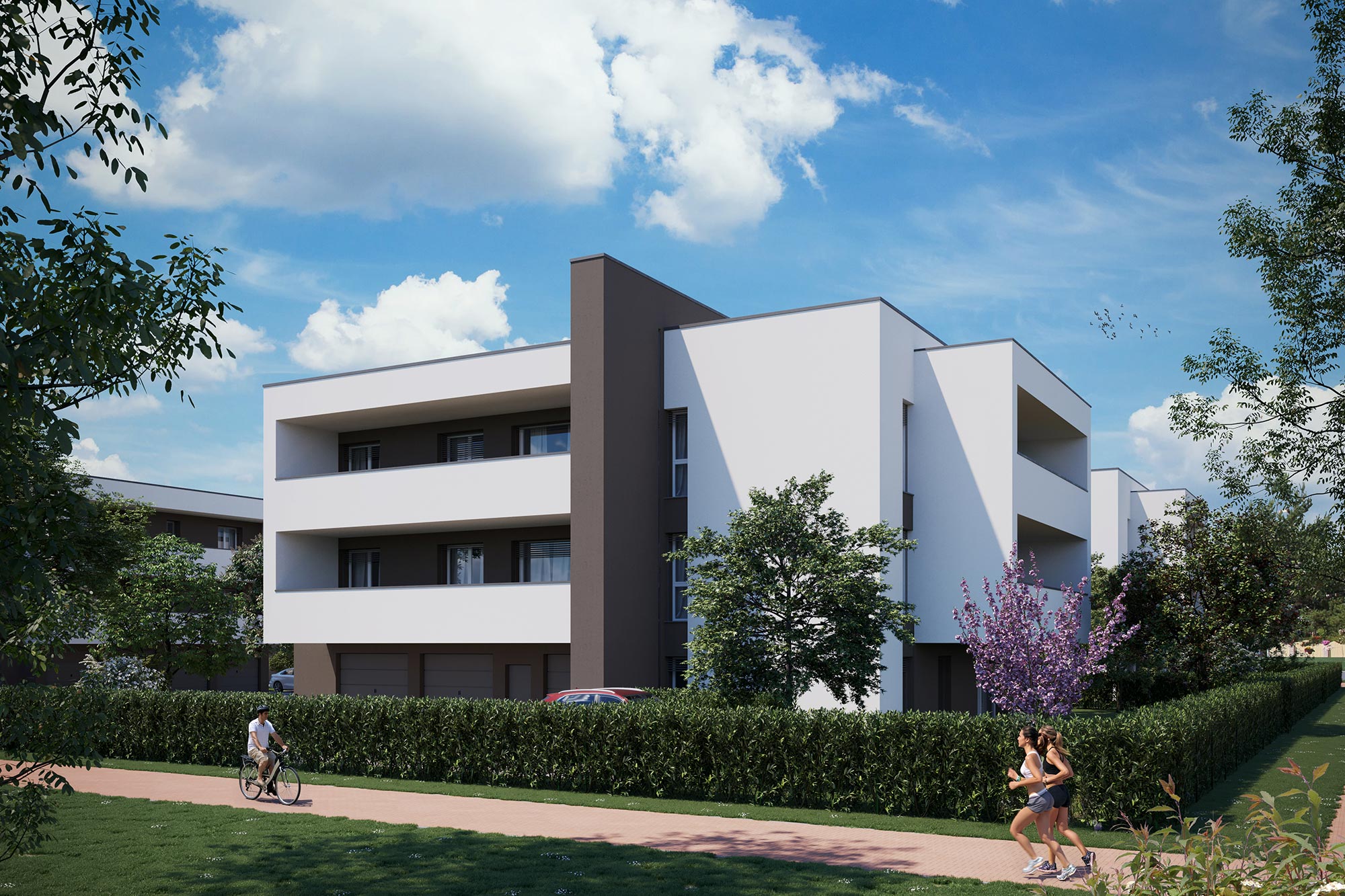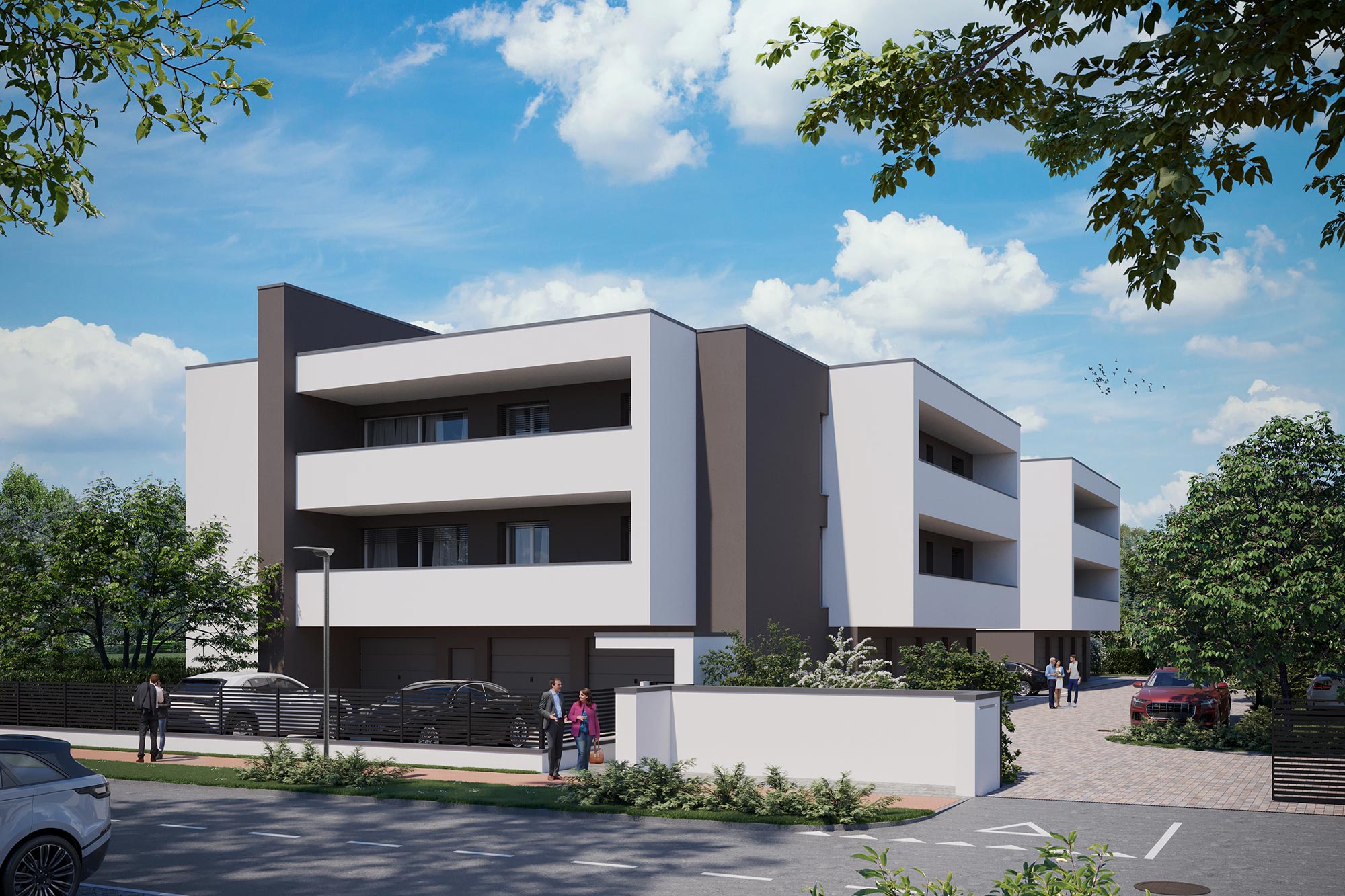 A ciascun appartamento sarà inoltre abbinata una autorimessa di pertinenza esclusiva a piano terra, nonché, un posto auto scoperto di proprietà inserito all’interno di una corte esclusiva interamente recintata.