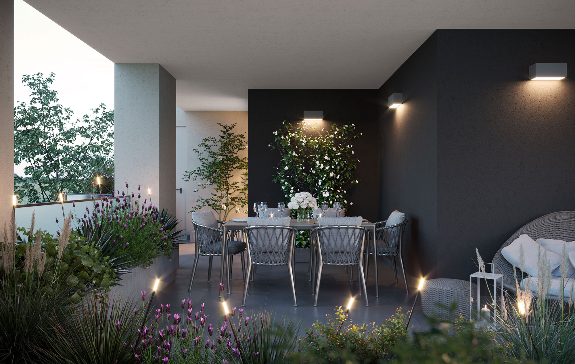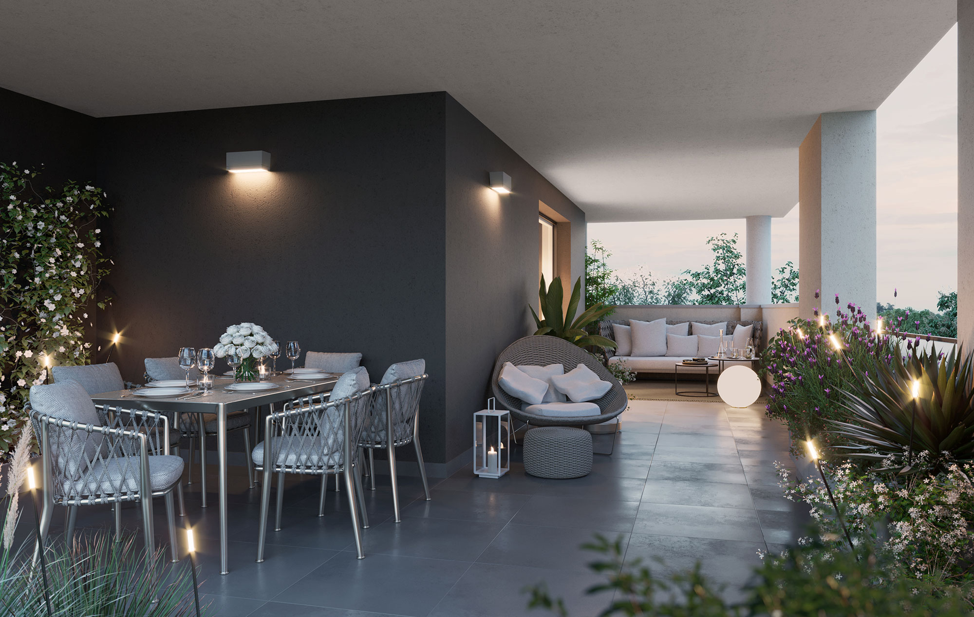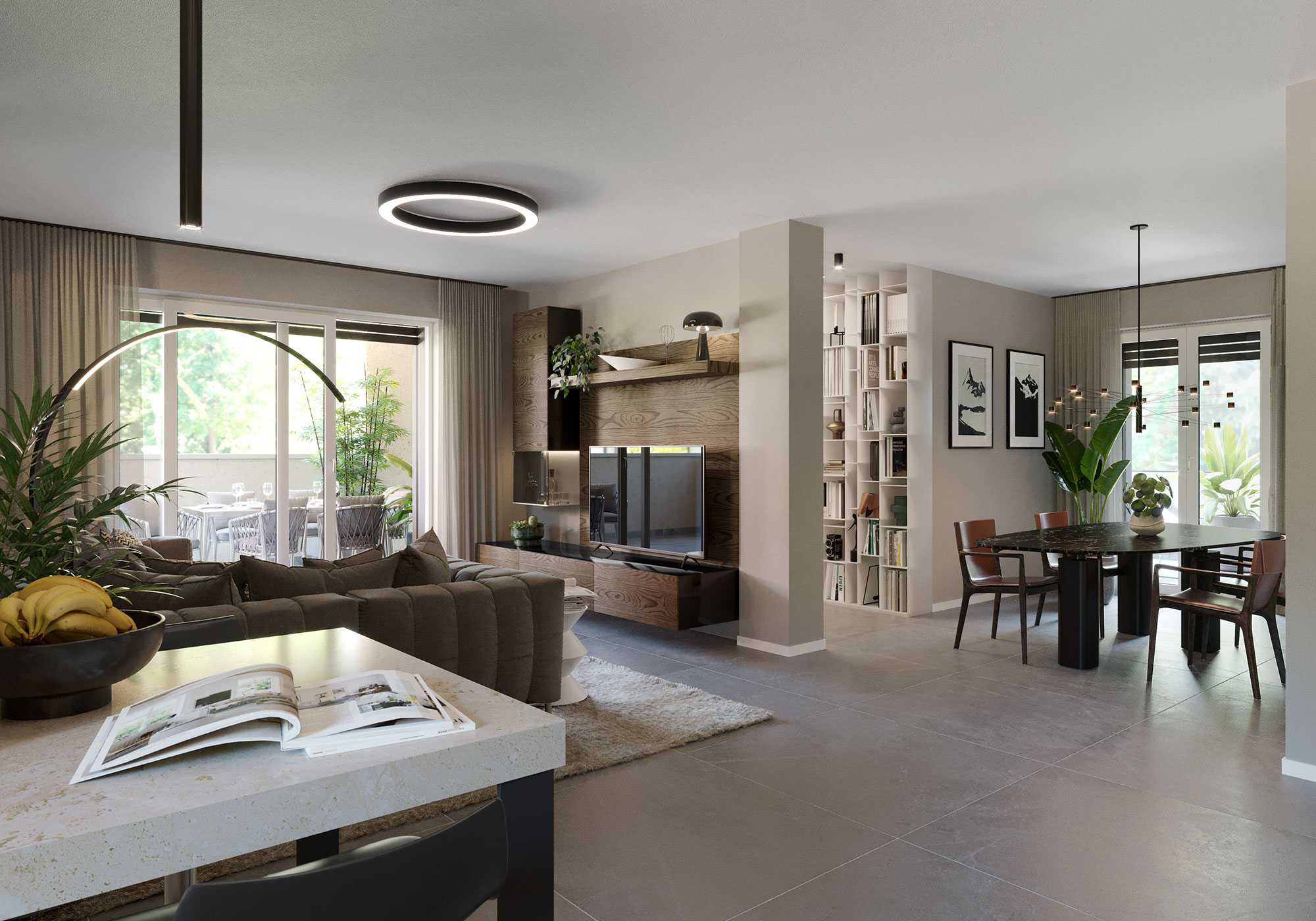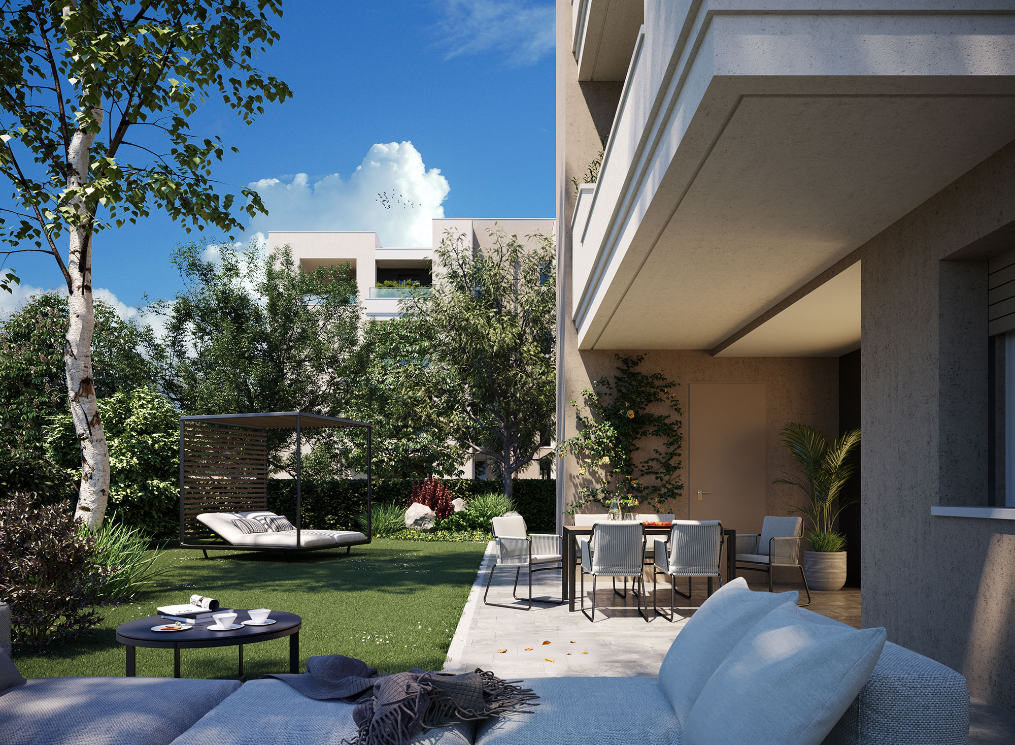 Gli appartamenti sono tutti dotati di luminose vetrate sulla zona living dalle quali si accede alle logge/balcone o ai terrazzi o ai giardini.