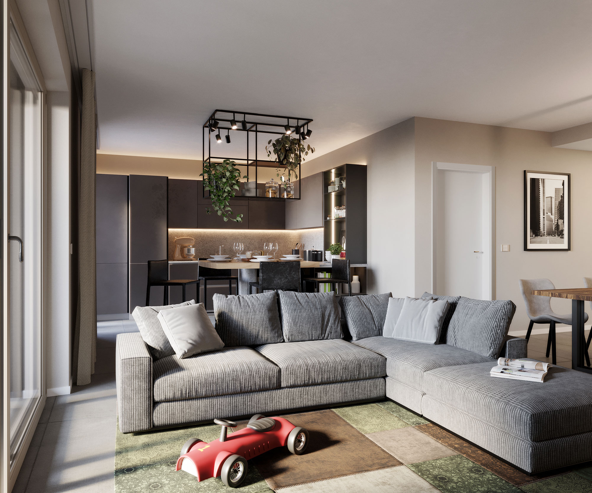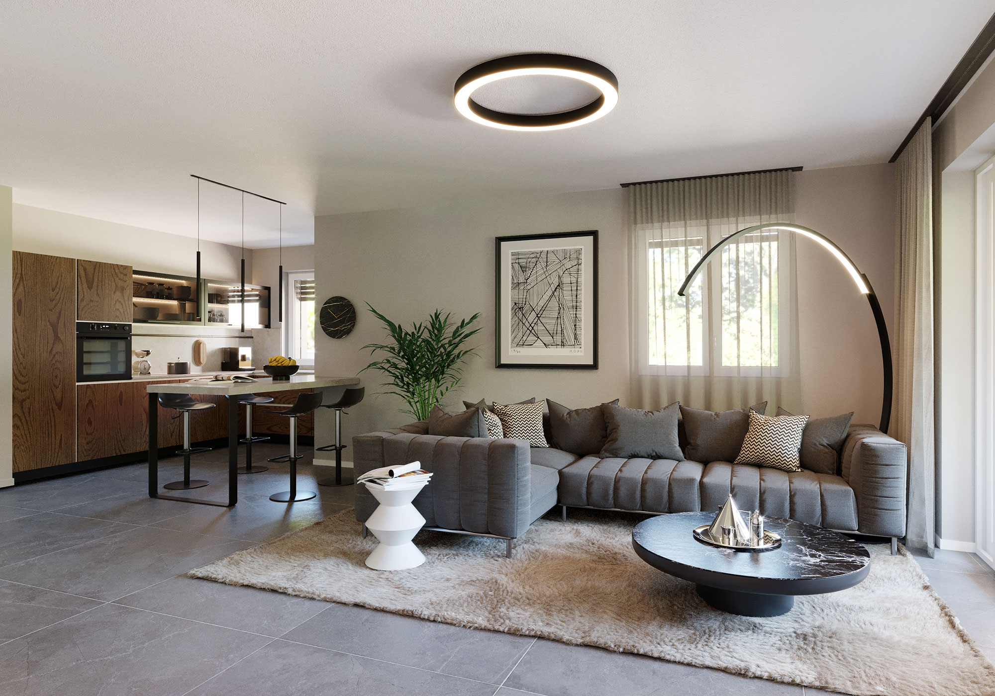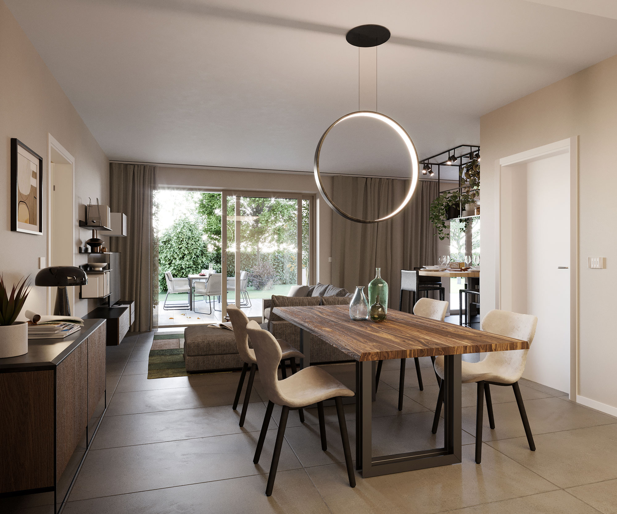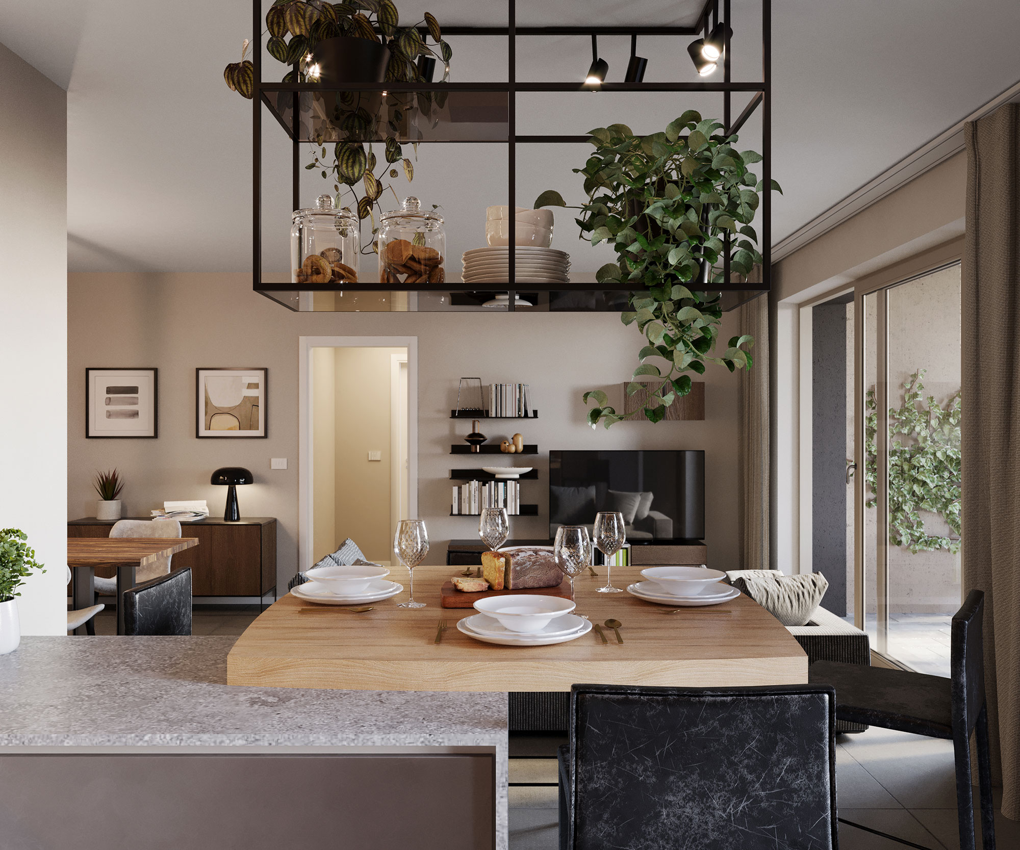 Gli appartamenti sono tutti dotati di luminose vetrate sulla zona living dalle quali si accede alle logge/balcone o ai terrazzi o ai giardini.
