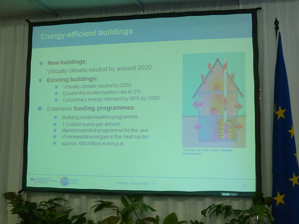 Mi auguro e credo che si cambierà strada non solo nel pianeta ma anche nel nostro paese perché questa è un’opportunità, hanno più volte ribadito le organizzazioni imprenditoriali e sindacali della Germania a “side event”, i seminari collaterali ai negoziati a cui ho partecipato negli ultimi anni. Un settore cruciale di intervento, è stato detto a Durban dal ministro dell’ambiente della Germania, è quello degli edifici che già nel 2020 dovranno, per quelli nuovi, essere “carbon neutral”, mentre tutti quelli esistenti dovranno diventarlo andare al 2050, tagliando di oltre 80% il fabbisogno totale di energia.