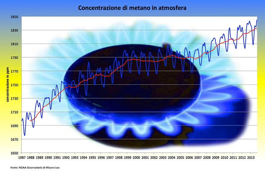Un altro gas serra di cui meno si parla, ma molto importante per regolare l’effetto serra è il metano (CH4). Assai meno abbondante in atmosfera, ma è 32 volte più efficace della CO2 ad aumentare l’effetto serra è il metano. Nel 2012 era presente in atmosfera a 1808 ppb (parti per bilione, ovvero molecole ogni miliardo di molecole di aria) e oggi, dopo alcuni anni in cui era stabile, sta di nuovo aumentando e l’ultimo dato disponibile lo indica a 1844. Da dove viene questo eccesso di metano, che prima dell’era industriale non ha mai superato, da oltre un milione di anni, quota 700 ppb?Difficile dirlo, il metano infatti proviene principalmente da allevamenti, risaie e agricoltura intensiva, ma anche dalle fughe nelle fasi del metano come combustibile. Un’altra fonte di metano sono i rilasci del permafrost, il terreno ghiacciato tipico delle zone subpolari, delle steppe, della Siberia e nord del Canada. Se è questa la fonte dell’aumento di metano, sarebbe il segnale di un pericolo di feedback inaspettato, ovvero il riscaldamento del suolo nelle zone artiche che ne causa il rilascio degli idrati di metano intrappolati. In vari siti e blog si rincorrono foto di misteriosi crateri che si sono aperti in siberia, un rilascio incontrollato di questi potrebbe portare fuori controllo il global warming in poco tempo.Insomma il metano, pur meno inquinante del gasolio o della benzina, non è “ecologico” nel vero senso della parola sia perché è anch’esso un combustibile fossile sia perché è un gas serra.