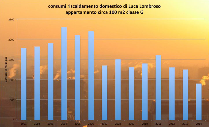 Il primo, fu il cambio della caldaia, da un vecchio impianto a spia-pilota ad una più moderna, anche se non ancora a condensazione come sono diffuse oggi, per le quali il discorso è complesso e non mi addentro. Chiaro comunque che il miglioramento della tecnologia ha portato benefici. Non è detto però che cambiare la caldaia sia la cosa da fare per prima, anzi ribadisco il paragone del secchio bucato da riempire. Tappereste i buchi, o cambiereste rubinetto? Lo stesso vale per le case, spesso colabrodo energetico. Prima va migliorata l’efficienza poi si interviene sugli impianti.