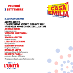 Venerdì 3 settembre alle ore 21.00, presso lo Spazio Cultura della Festa de l’Unità di Modena, si terrà un dibattito sul tema «Abitare Senior. Le cooperative di abitanti di fronte alle sfide delle nuove esigenze dell’abitare», in occasione del quale sarà presentata pubblicamente un’indagine sul tema del Senior Housing promossa dalle cooperative modenesi Abitcoop e Unicapi, e dalla Cooperativa Castello di Ferrara.