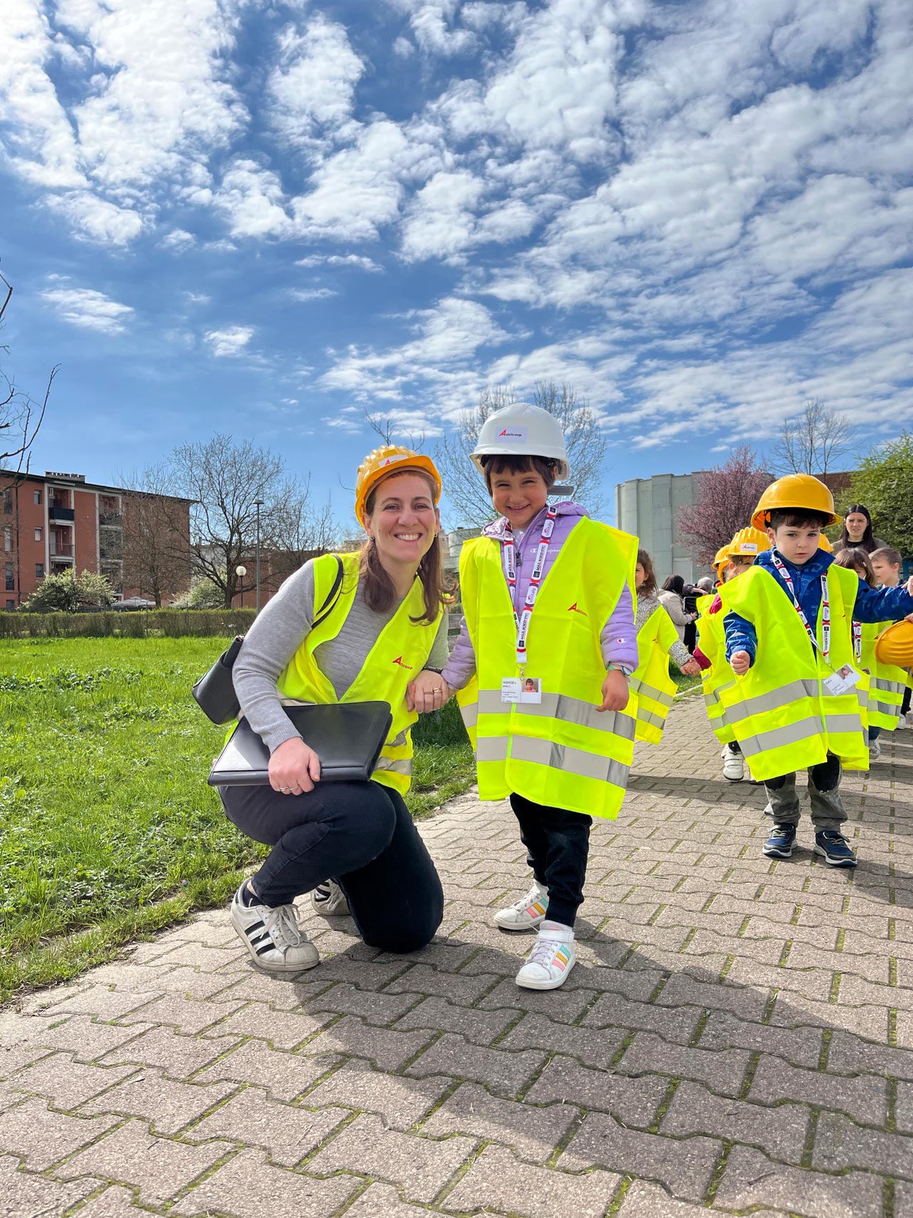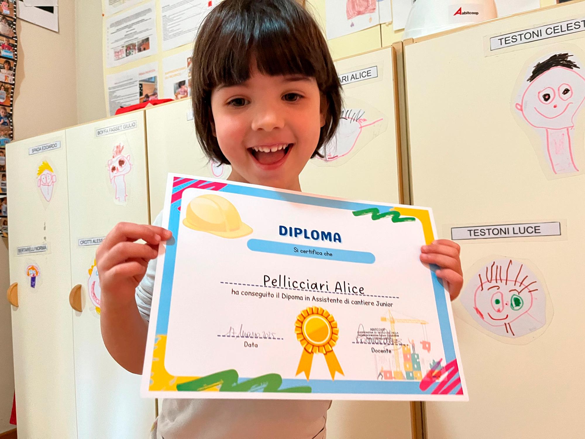 L’idea nasce in seguito a un laboratorio in cui i bambini hanno raccontato il lavoro dei loro genitori e la visita al cantiere è stata organizzata dalla geom. Bruzzi, responsabile della sicurezza a Parco dei Fiori, la cui figlia è ritratta in foto con il diploma.
